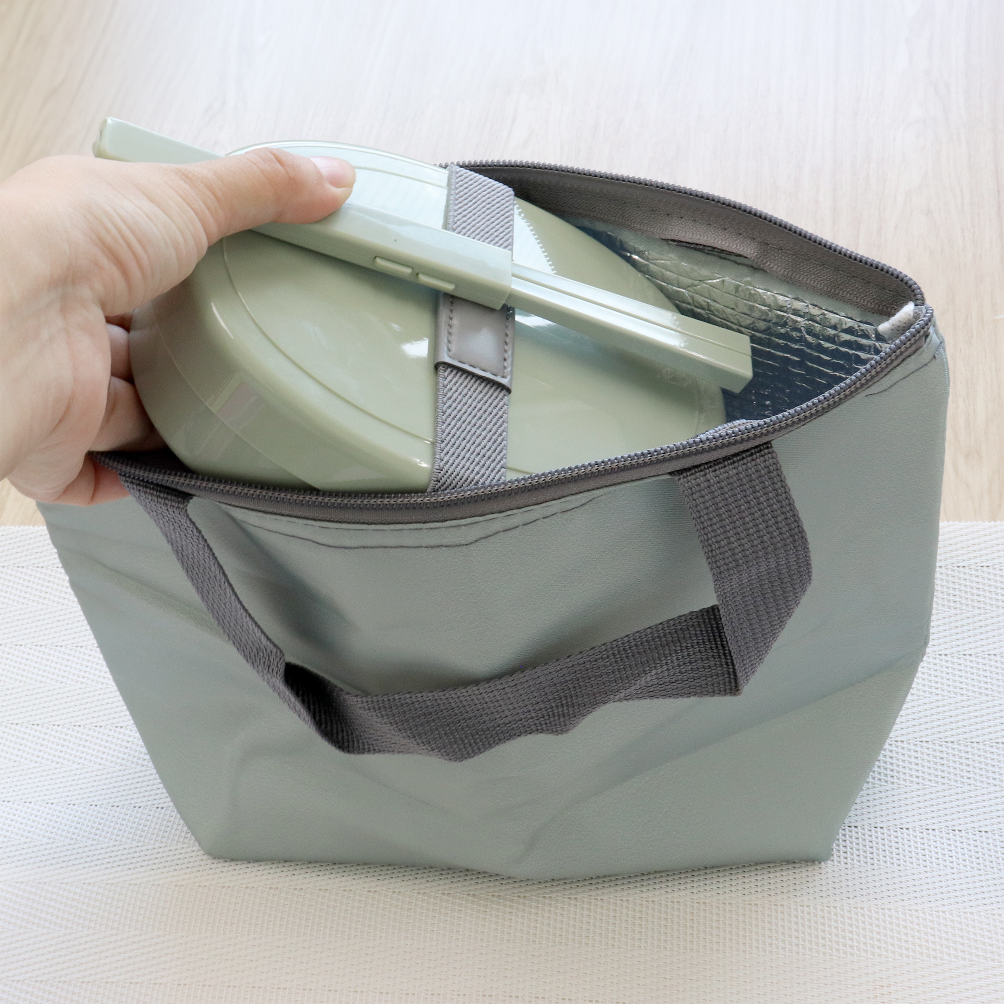 ランチバッグは内側にアルミ蒸着シート付きで、保温にも保冷にも使えます。