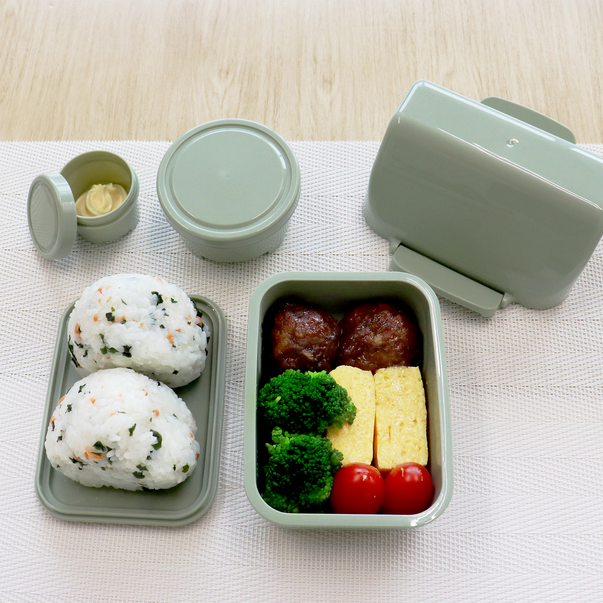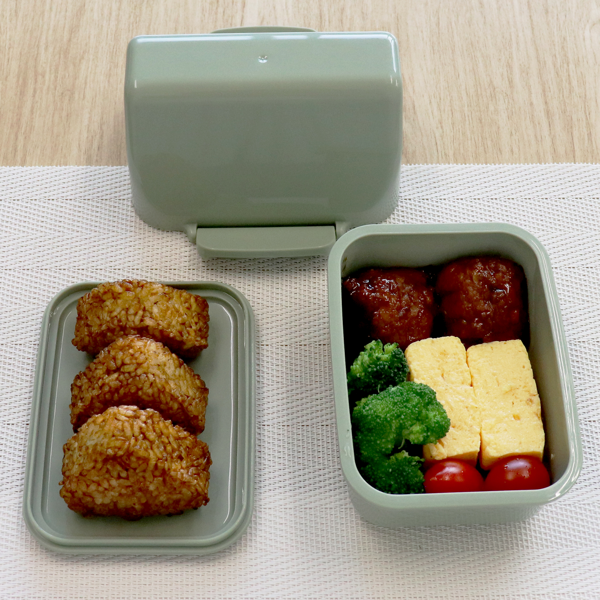 ◎下の容器におかずを入れて、中フタの上におにぎりをのせてフタをする、コンパクトなお弁当箱。